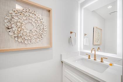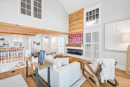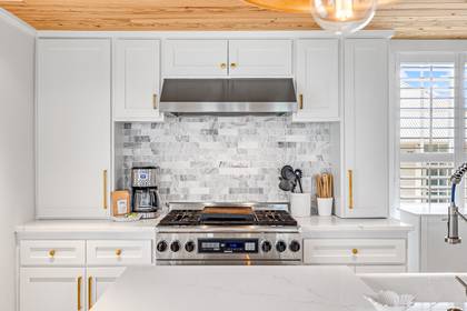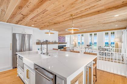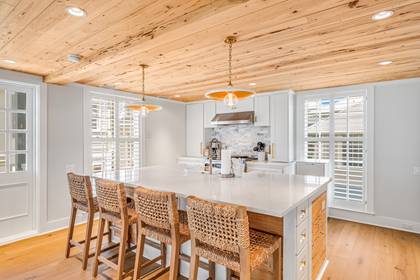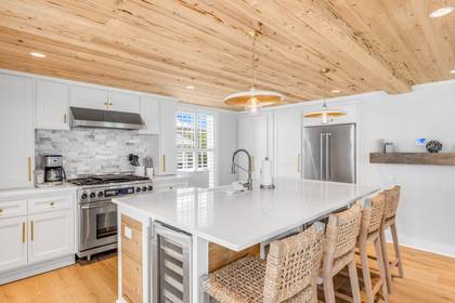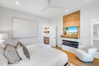 Next to the living area, a large marble island with barstool seating for three leads into the open kitchen. Stylish gray cabinets and sleek quartz countertops provide plenty of space for whatever you have in mind— from preparing stacks of fresh banana pancakes for your crew before they hit the beach or perhaps mixing up a pitcher of frozen margaritas before heading out to dinner. Premier appliances include a dishwasher, gas range, spacious refrigerator, and an in-drawer microwave.