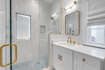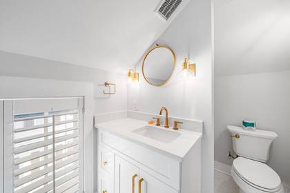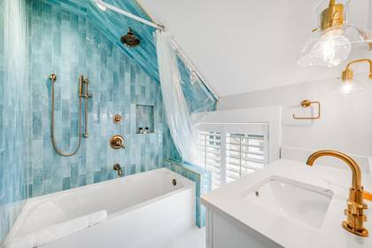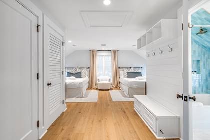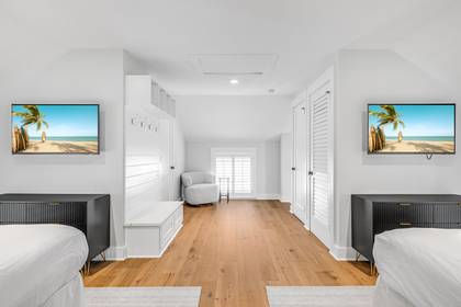 Another staircase leads up to the top level, where the third guest bedroom sits tucked cozily underneath the eaves. In this room, there are two queen-size beds, each with its own HDTV. The ensuite bathroom includes a large step-in shower and a marble vanity.