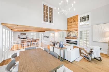 Climb the classic stairway up to the main level, where the open and inviting great room is located. With multiple glass doors framing the ocean views and leading outside to the gulf-front patio, this room is ideal for relaxing indoor/outdoor living. You can open the doors wide to catch the gentle sea breezes and take your morning mug of fresh coffee outside to watch for dolphins swimming past. Inside, the vaulted ceilings and dark wood floors surround the plush furnishings and large HDTV. There’s also a large DINING SPACE with seating for four, and the whole room is illuminated with warm, artistic lighting fixtures.