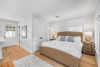 Atwoods Cottage & Carriage House was built on a slightly oversized lot, allowing for plenty of convenient parking in the garage and a large, cobblestoned courtyard between the main home and the carriage house. On the first floor of the main home are two private bedroom suites. The first room is a sitting room with a sleeper sofa and a hallway-accessed powder room, and the second is the luxurious primary bedroom suite, with a king-size bed and an attached full bathroom with a large step-in shower.