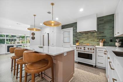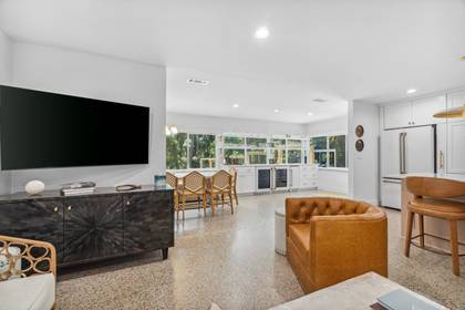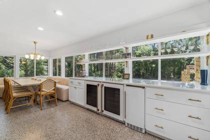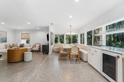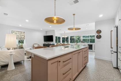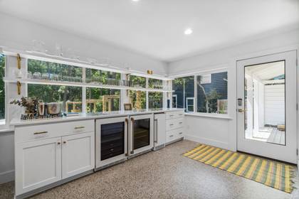 On one side of the GREAT ROOM, there is a fully-equipped KITCHEN with crisp white cabinets and glossy quartz countertops. Open shelving in front of the windows catches and reflects the light off the glassware. There’s also a spacious center island with bar stool seating, a high-end gas range, a huge, double-front refrigerator, and a dishwasher. A wine fridge and stand alone ice maker across the way makes it easy to mix drinks for your friends and family.