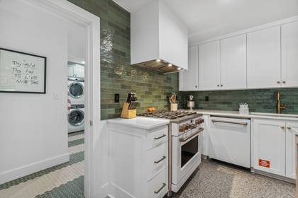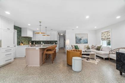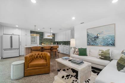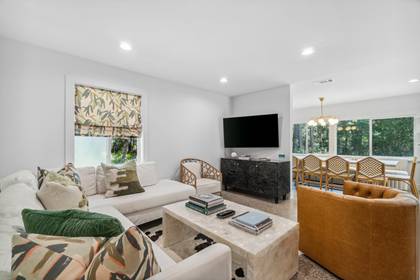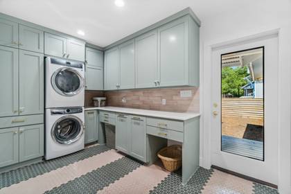 Next to the kitchen is the LIVING AREA, complete with a large HDTV that sits in front of a comfy sectional sofa and a stylish leather armchair. There’s also a full DINING ROOM with seating for six, right next to the living area, and a spacious LAUNDRY ROOM just off the kitchen.