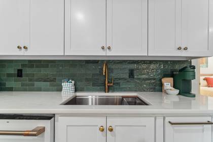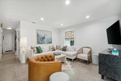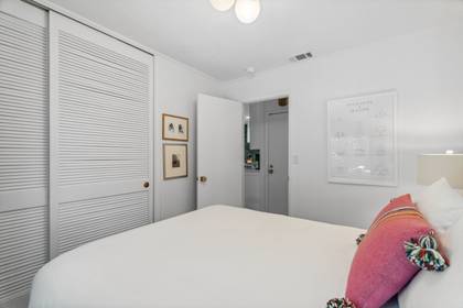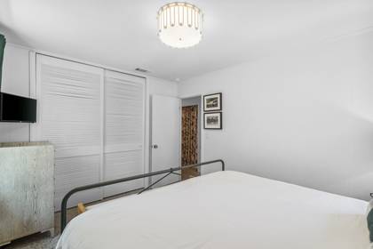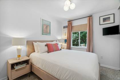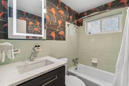 Each of the two separate bedrooms is located down a short hallway. The FIRST BEDROOM has a luxurious king-size bed and an HDTV, while the SECOND BEDROOM has an inviting queen-size bed and an HDTV. Across the hallway from both bedrooms is the single FULL BATHROOM, with a tub/shower combo and a quirky, flamingo wallpaper.