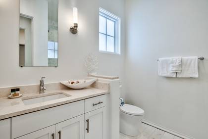 A full kitchen offers the same amenities as the main home, as in solid-surface counters, stainless steel appliances, and generous prep space. The center island seats 4. The bedroom boasts a queen-size bed, dual nightstands, and lamps. Other features include a large dresser and flat-screen TV. A gracious bath has a walk-in shower.