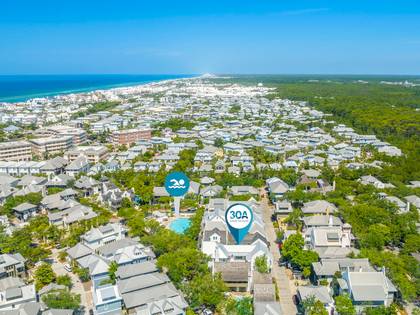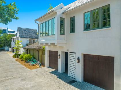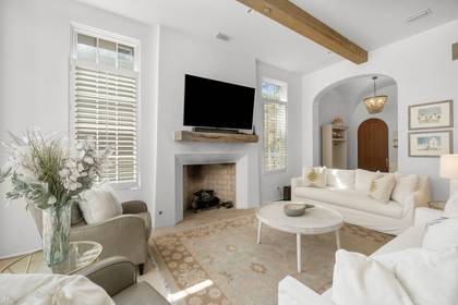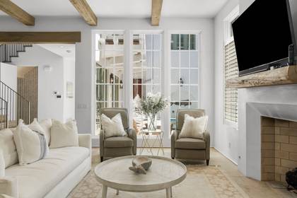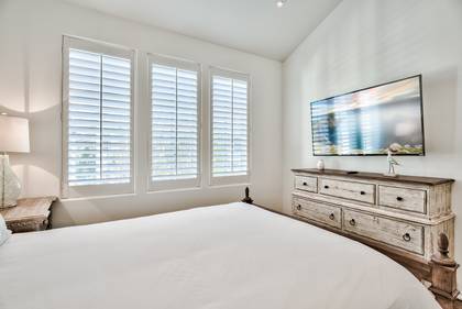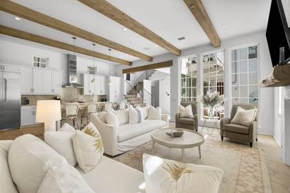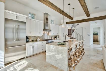 Interior [59]The Harper Cottage & Carriage House in Rosemary Beach offers the feel of a French country manor, with whitewashed walls, wood beams, and an air of effortless elegance. As you enter through the curved door, you’ll find yourself in the spacious great room. To your left is a formal dining room, with a long table for 8, in front of a bank of windows. Other amenities include a wet bar and beverage refrigerator.