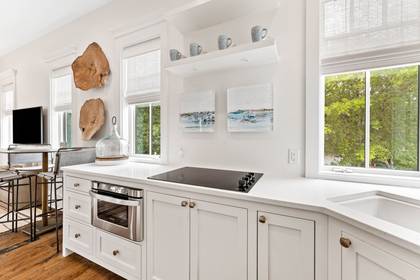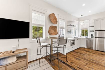 The guest carriage house is a private haven, offering a full living room and kitchen. This self-contained space is perfect for visitors seeking a bit of solitude. The bedroom features a queen bed, and the full bathroom with a shower ensures a comfortable stay.