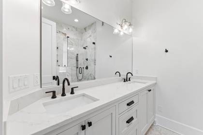 * PRIMARY BEDROOM SUITE with king bed, dual nightstands, lamps, triple dresser, flat-screen TV. En-suite bath with dual vanities, white-tiled walk-in shower with dual shower heads.