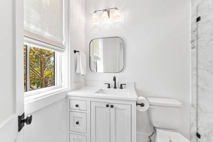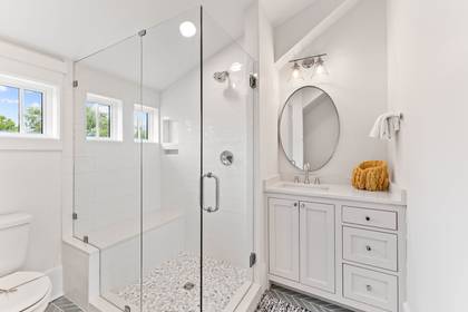 The carriage house loft provides additional sleeping quarters with a full bed and a full bathroom with a shower. This space is ideal for guests looking for a cozy retreat within the estate.