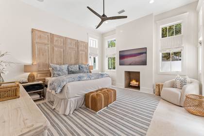 The first floor of this stunning estate welcomes you with an open-concept living room, dining area, and kitchen. Designed for modern living, the space is perfect for entertaining and family gatherings. The living room features a cozy fireplace, creating a warm and inviting atmosphere. The half bathroom is conveniently located for guests. The primary bedroom suite is a sanctuary of comfort, featuring a king bed, dual nightstands, lamps, a dresser, and access to the pool and courtyard. The en-suite bathroom boasts dual vanities and a white-tiled walk-in shower, offering a spa-like experience. Additionally, the primary bedroom also includes its own decorative fireplace (not functional), adding an extra touch of luxury.