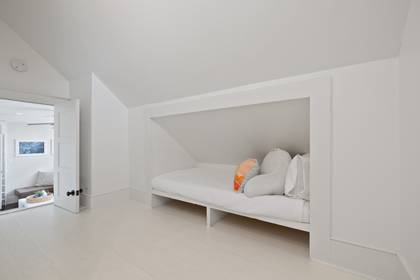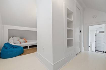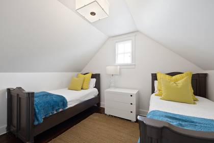 Moving up to the third level, this loft-style room holds has a large couch, a flat-screen TV & full bathroom. Off each side of the loft TV room is a small ladder with twin parallel twin beds on one side and two twin beds in a hallway shaped like a "J". The kids will love these rooms, as they’ll be like their own little fort for their time at the beach.