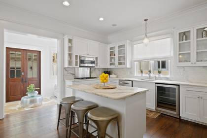Once through the sitting room, you will find yourself in an open-concept kitchen and dining room with all Viking appliances and a gorgeous wood dining table with a high-back chair on one side, bench seating on the other, and two end chairs to complete the table. The living room is just past the stairs and is flooded with natural light from the many windows and another set of french doors leading to the side of the house and the boardwalk to the beach.