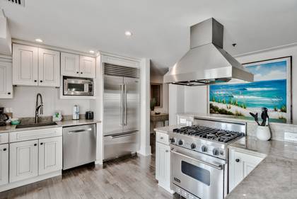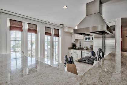 * Kitchen with marble counters, stainless steel appliances, L-shaped island with seating for 3
