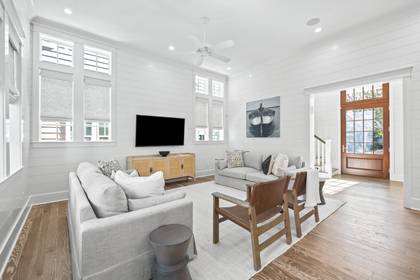 Our tour of Seaside Vibes begins with an inviting cobblestone driveway, which leads up to the front door and inside to the first-floor LIVING AREA. Here, two classic, neutral sofas flank the huge HDTV, while nearby, the open GOURMET KITCHEN has a spacious quartz-topped island with bar stool seating for four. Gleaming white quartz countertops, spotless white cabinets, and sleek stainless steel appliances complete this impressive space.
