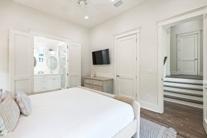 Also on the first floor, there’s a GUEST BEDROOM with a luxe king-size bed and an ensuite full bathroom that can also be accessed from the backyard patio, plus another GUEST BEDROOM with a queen-size bed and an attached FULL BATHROOM. Nearby, there’s a LAUNDRY ROOM and a convenient STORAGE SPACE to keep your beach chairs and towels.