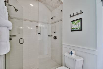 On the second level of Sylvia’s Cottage, guests will find 3 additional bedrooms. The Queen bedroom with a private balcony and the kid’s room with built-in bunk beds share a hall bath with a tub/shower. The second King master also has a private balcony. The en-suite bath features dual vanities and a spacious walk-in shower.