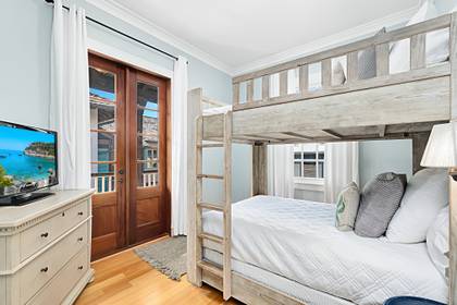 Terra Casa Cottage includes four serene bedrooms spaces— all located on the second level. The first is a primary suite, with a regal king-size bed, HDTV, sunny balcony, and spa-like ensuite bathroom. A secondary bedroom suite also houses a luxe king-size bed, HDTV, a terrace with views of the gulf and the green, and an attached full bathroom. The next bedroom is a bunk room, complete with a full-over-full-size bunk bed. Another bedroom also boasts a king-size bed, soaring cathedral ceilings, an HDTV, a sleeper sofa, and a full ensuite bathroom.