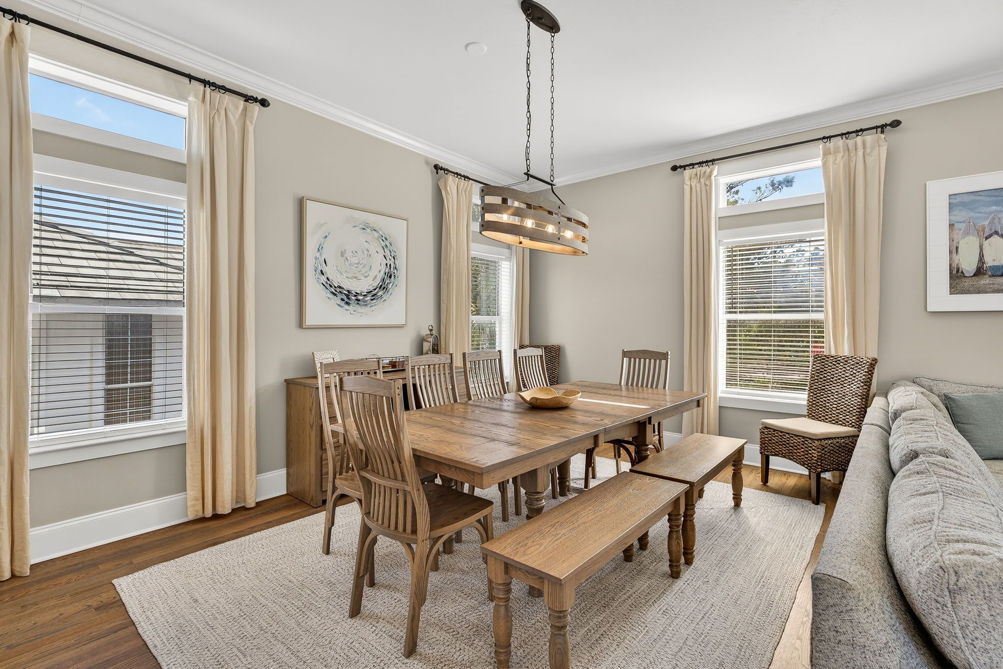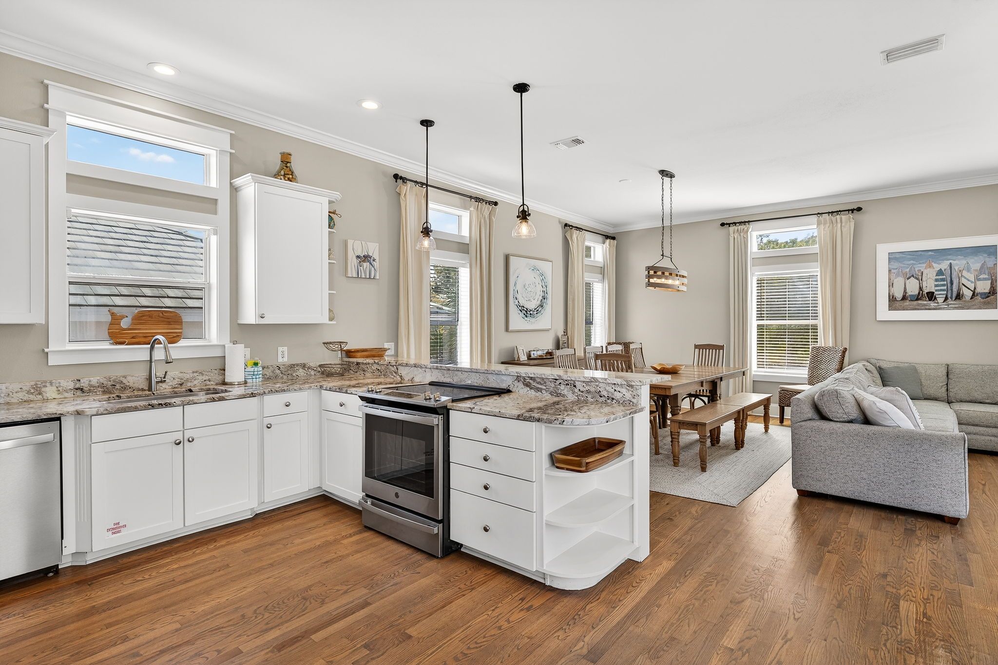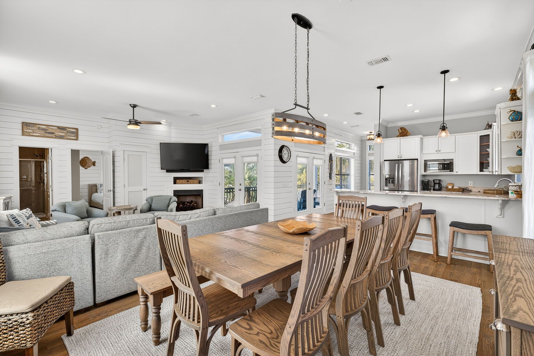 Dining: Table seating for 8-10 guests, plus bar seating for four