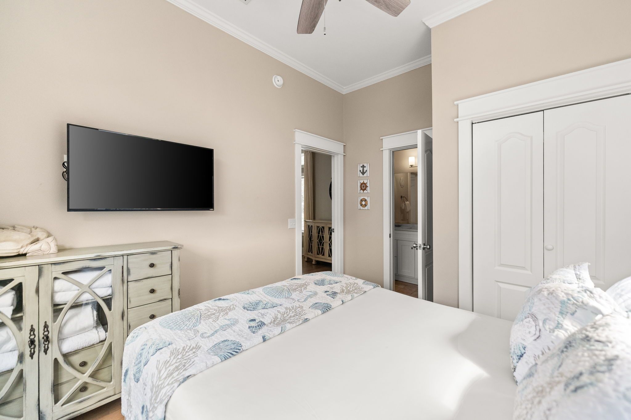Bedroom 5 (Master Suite): King bed with private bathroom with double vanity and large glass enclosed shower. Complete with a private balcony.