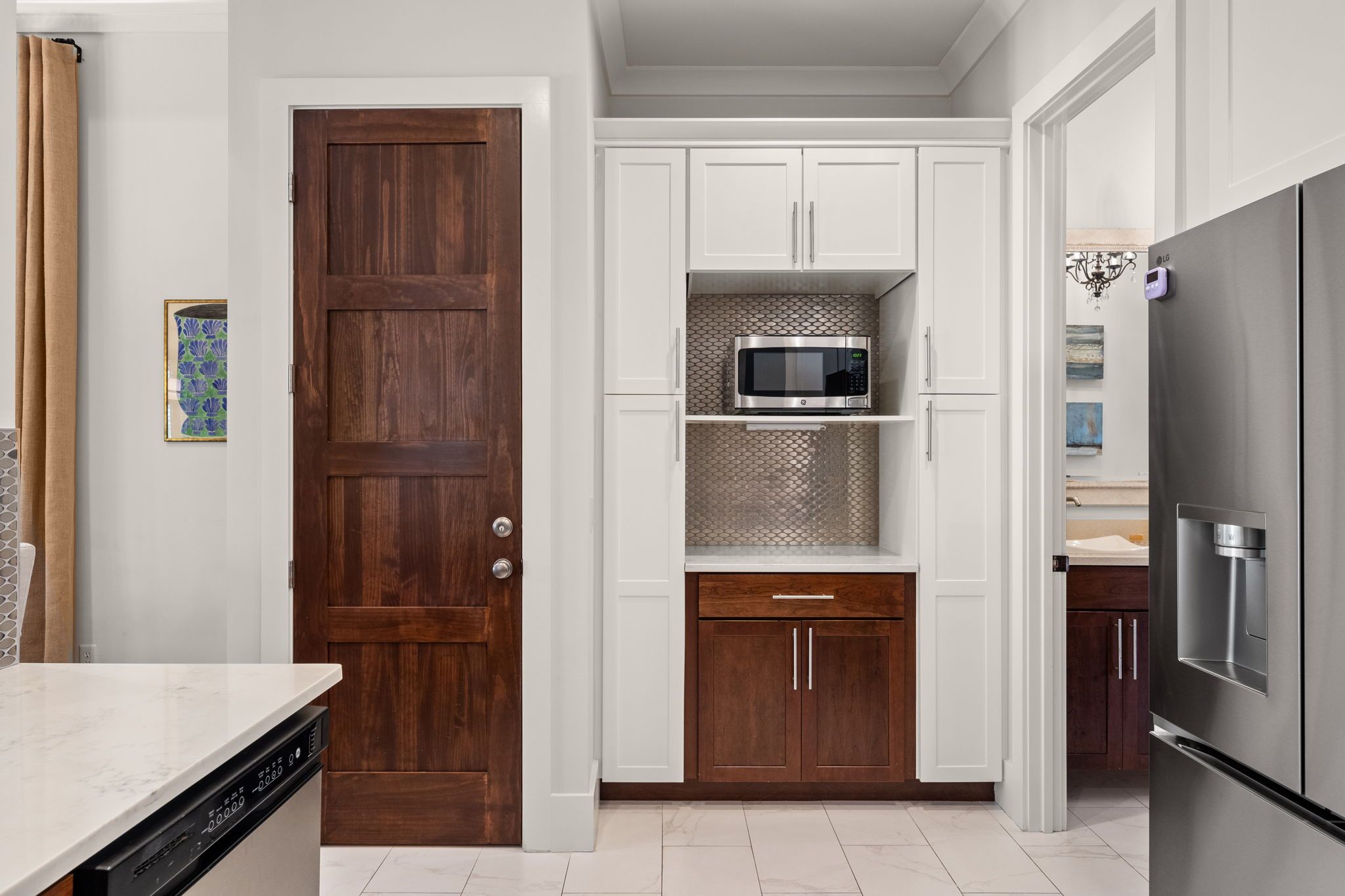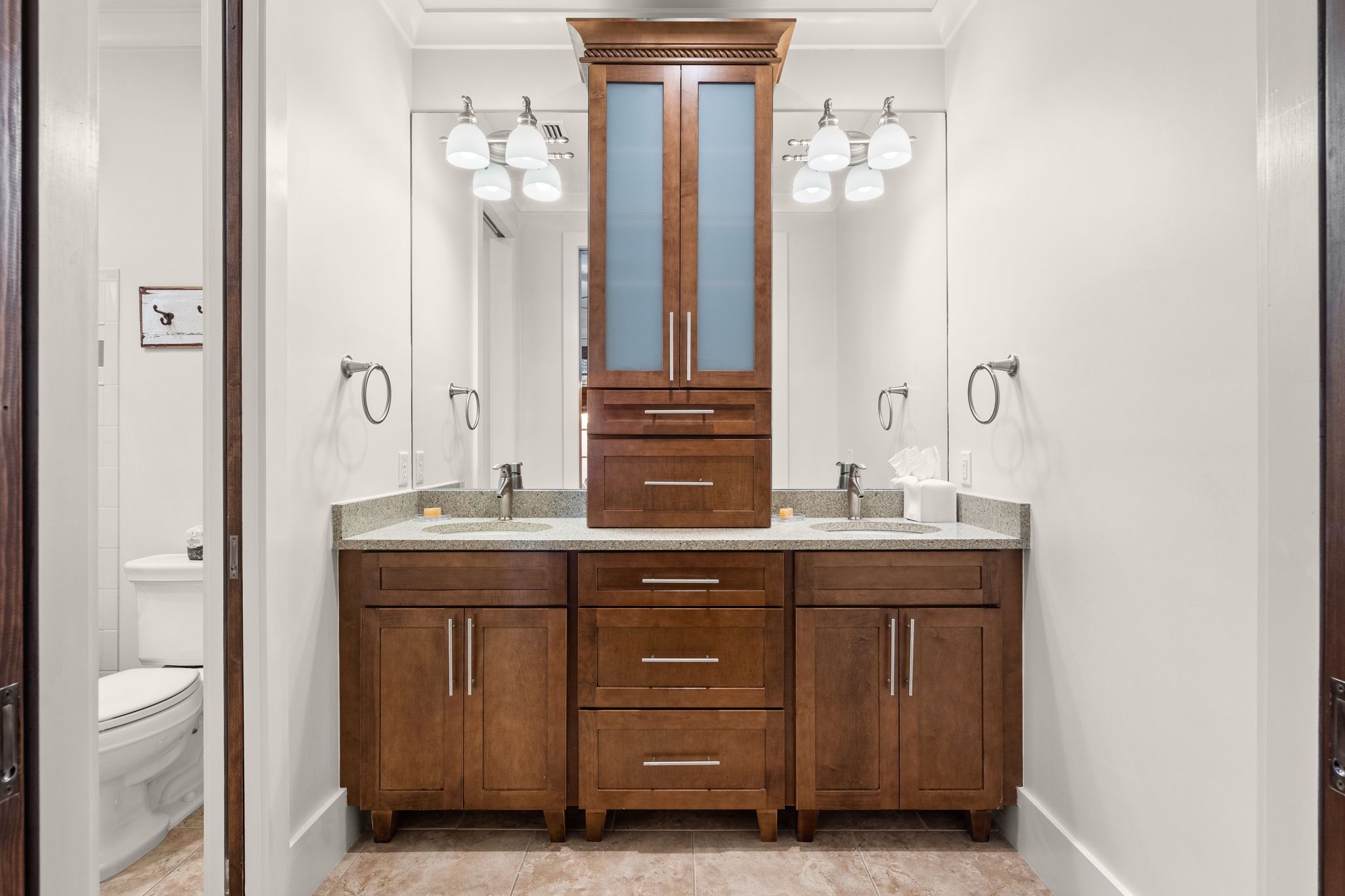 On the first floor, two serene master suites each feature private ensuite bathrooms with double vanities—one with a walk-in shower, the other with a shower/tub combo. A laundry room with washer and dryer is also located on this level for added convenience.