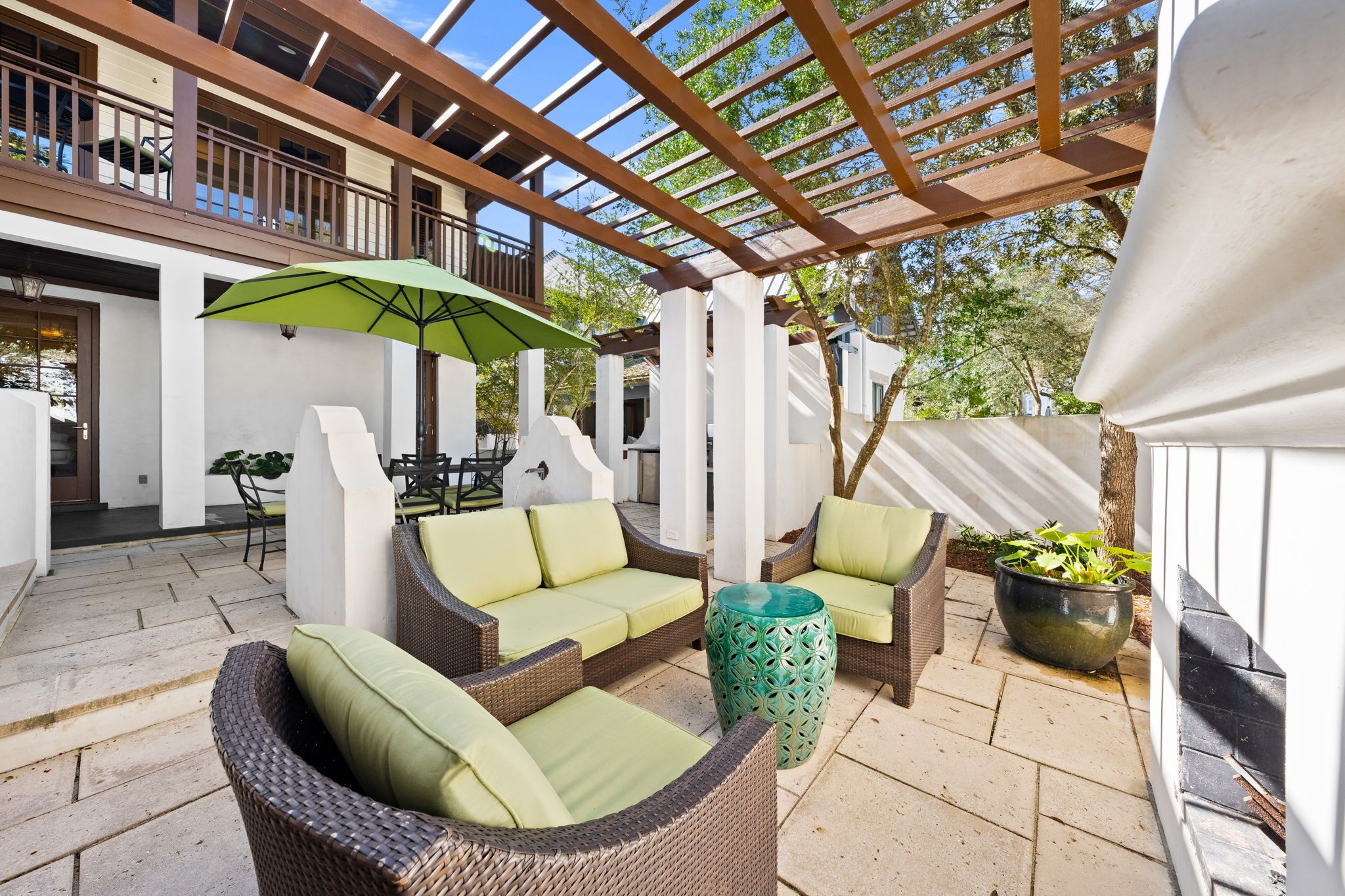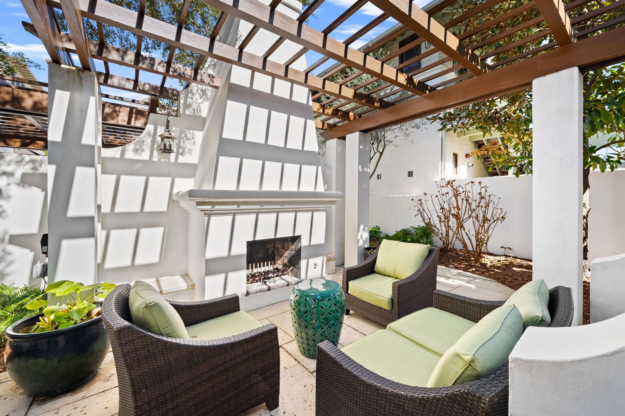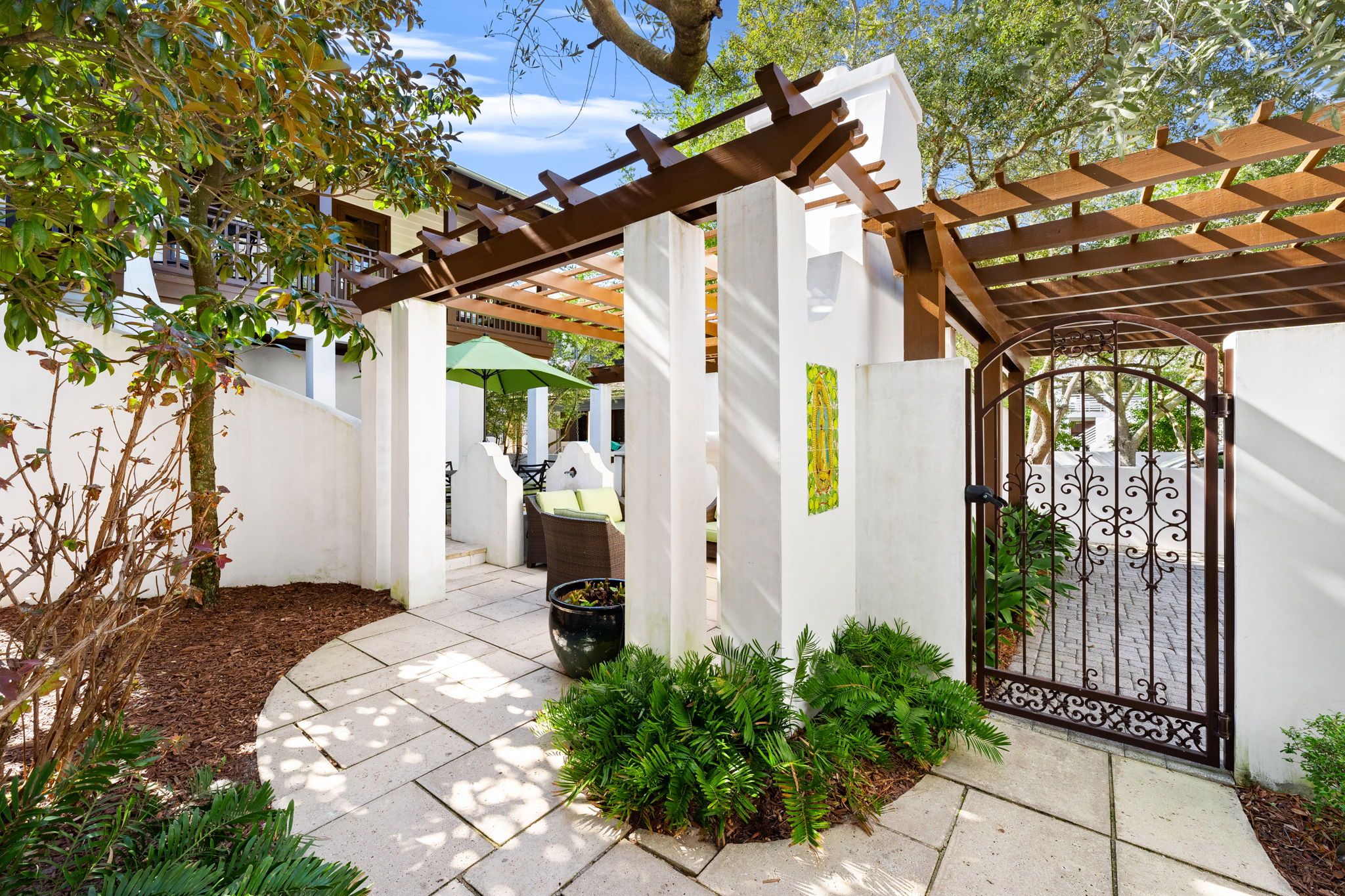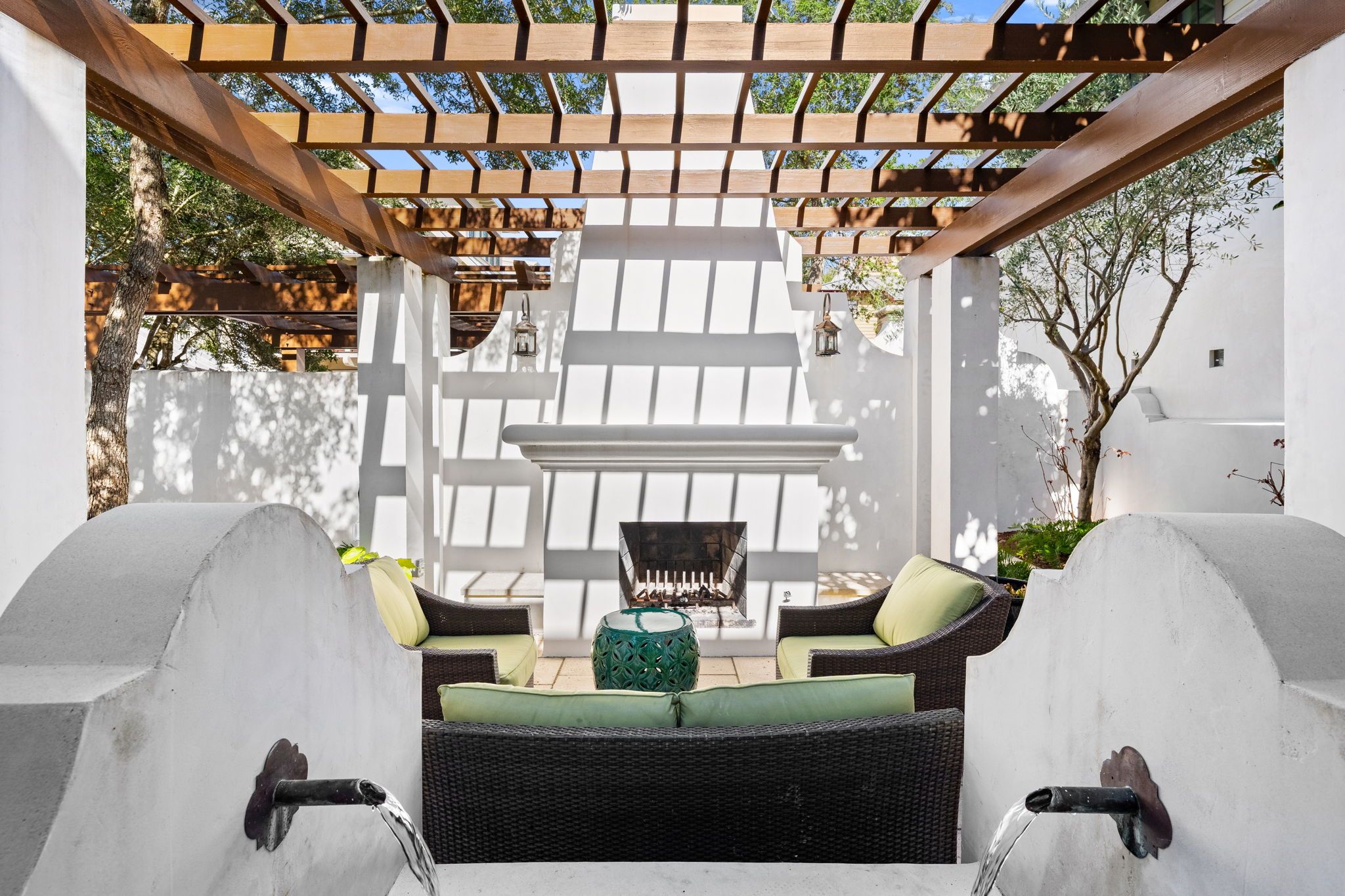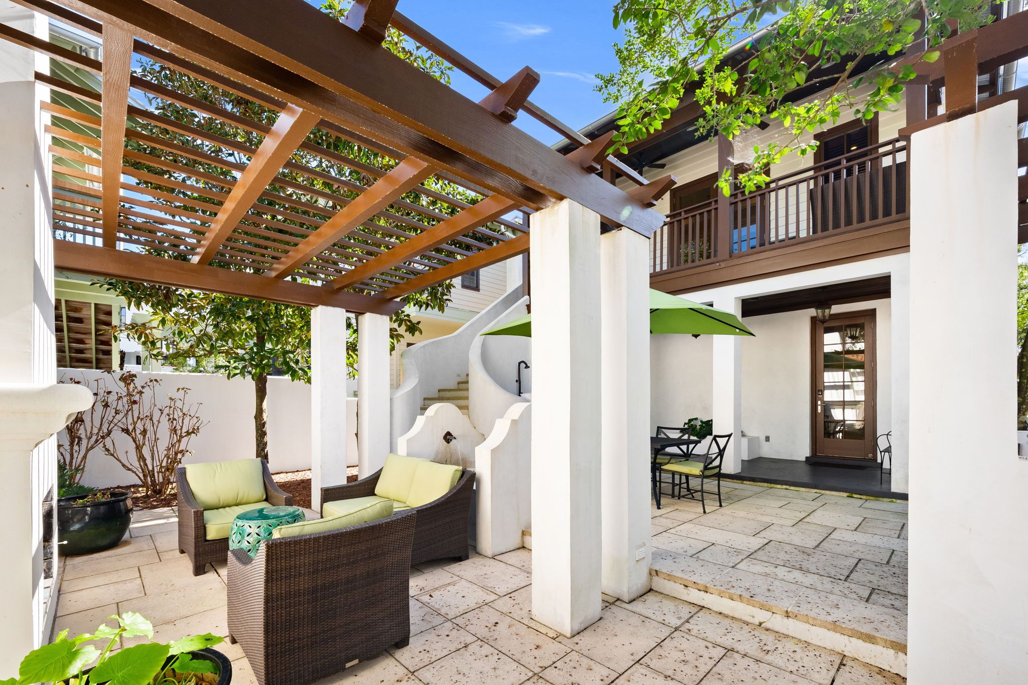 Welcome to Kingston Cottage, a timeless Mediterranean-inspired retreat in the heart of Rosemary Beach. Designed with an inverted floor plan to maximize natural light and privacy, this home blends lush outdoor living with stylish interiors. The inviting courtyard, complete with a calming fountain, alfresco dining, and plush lounge seating, sets the tone for a truly relaxing coastal escape.