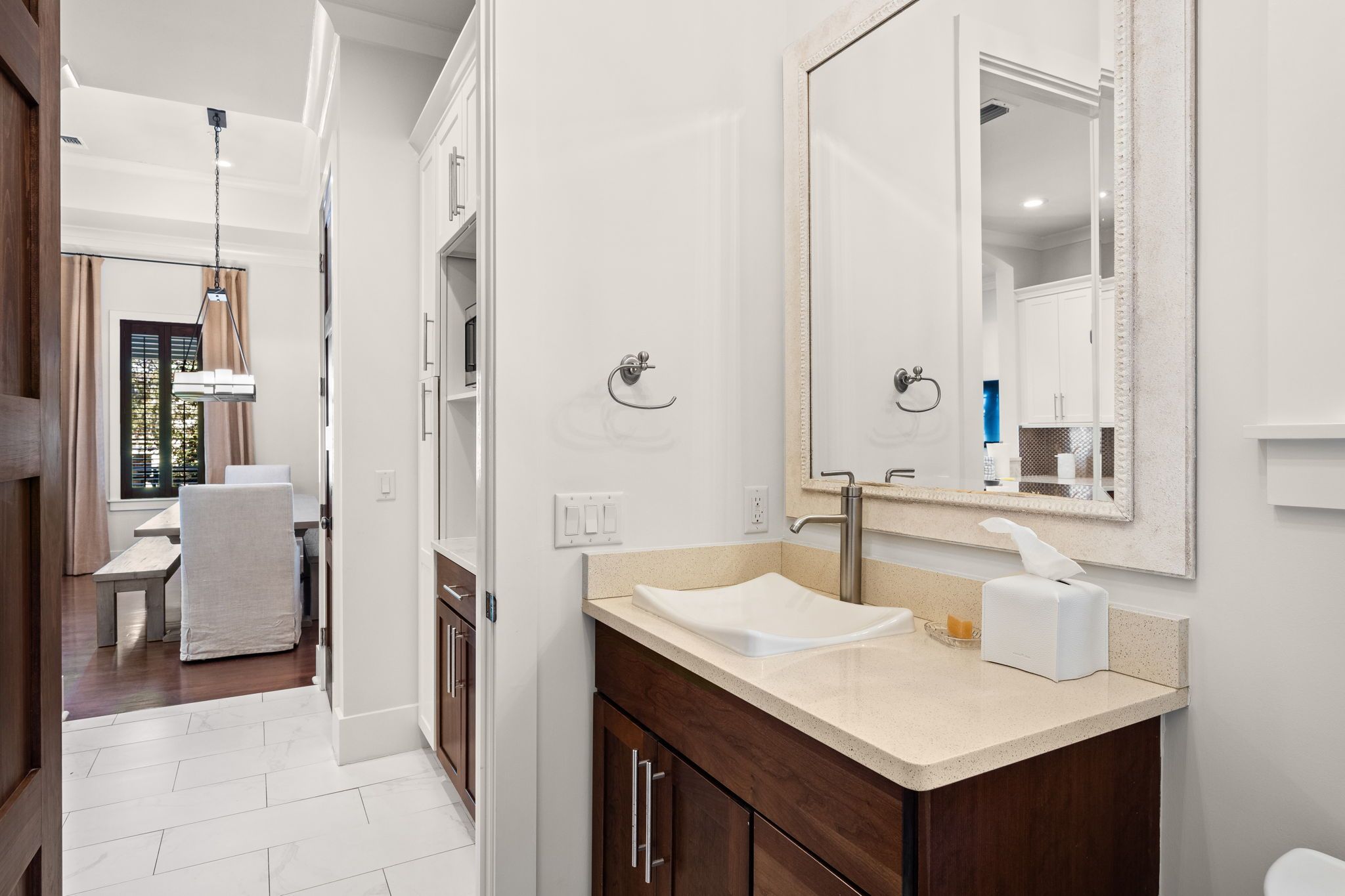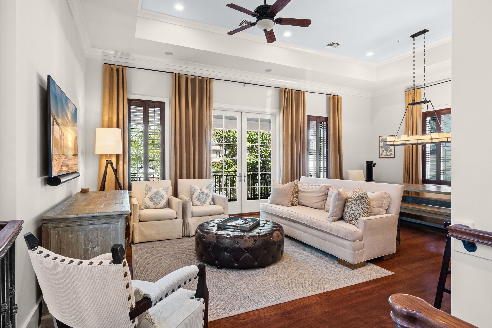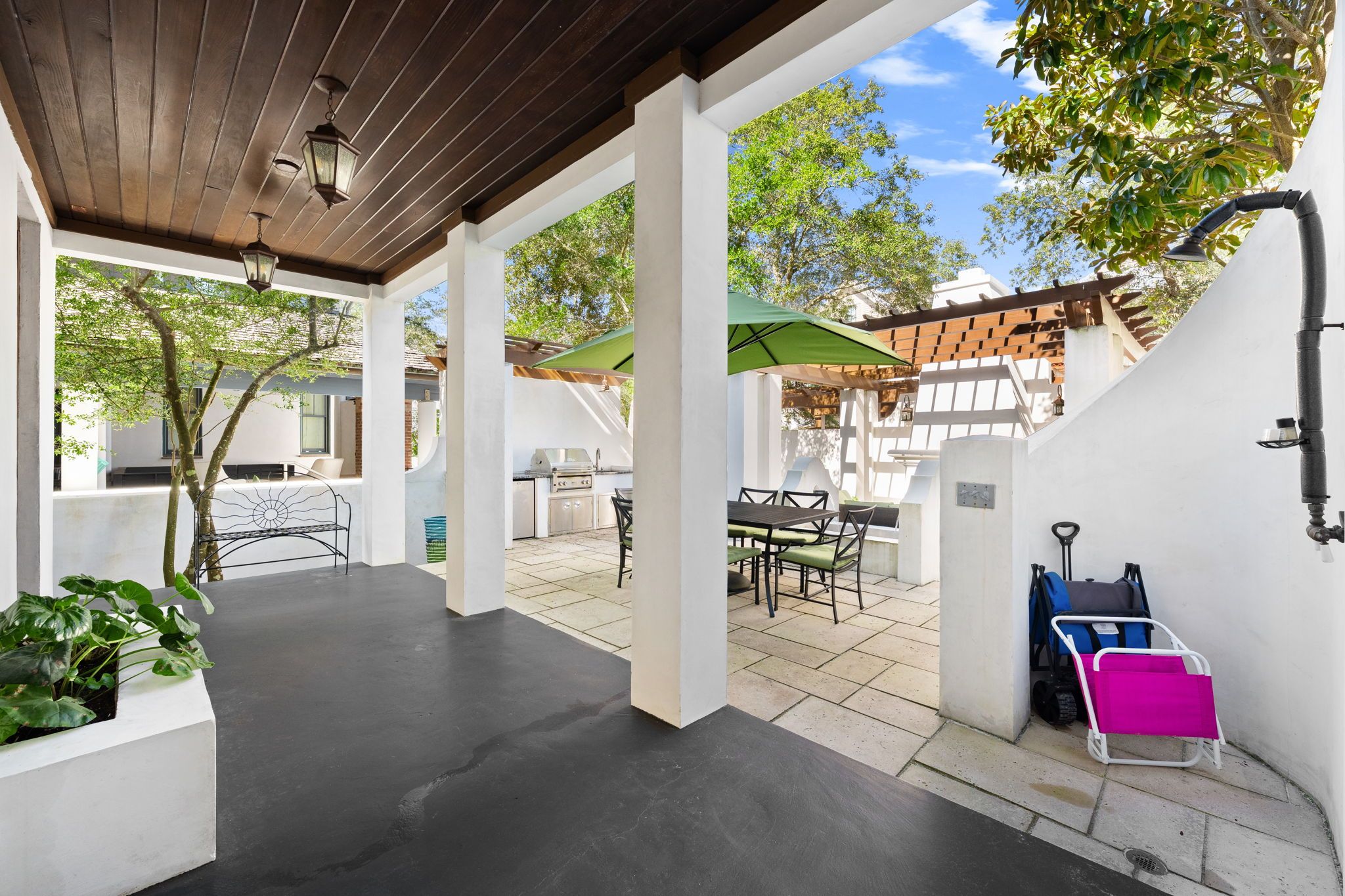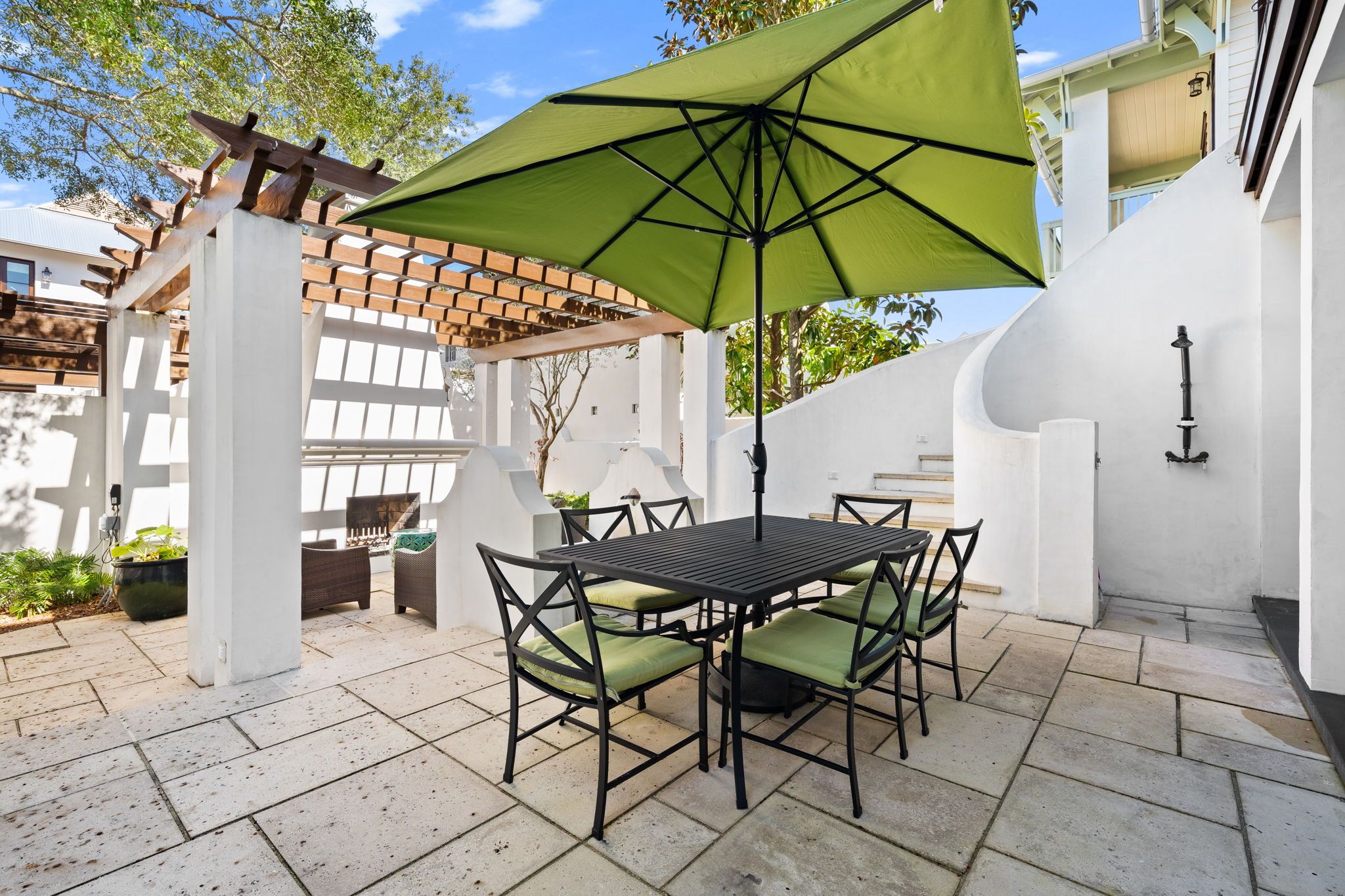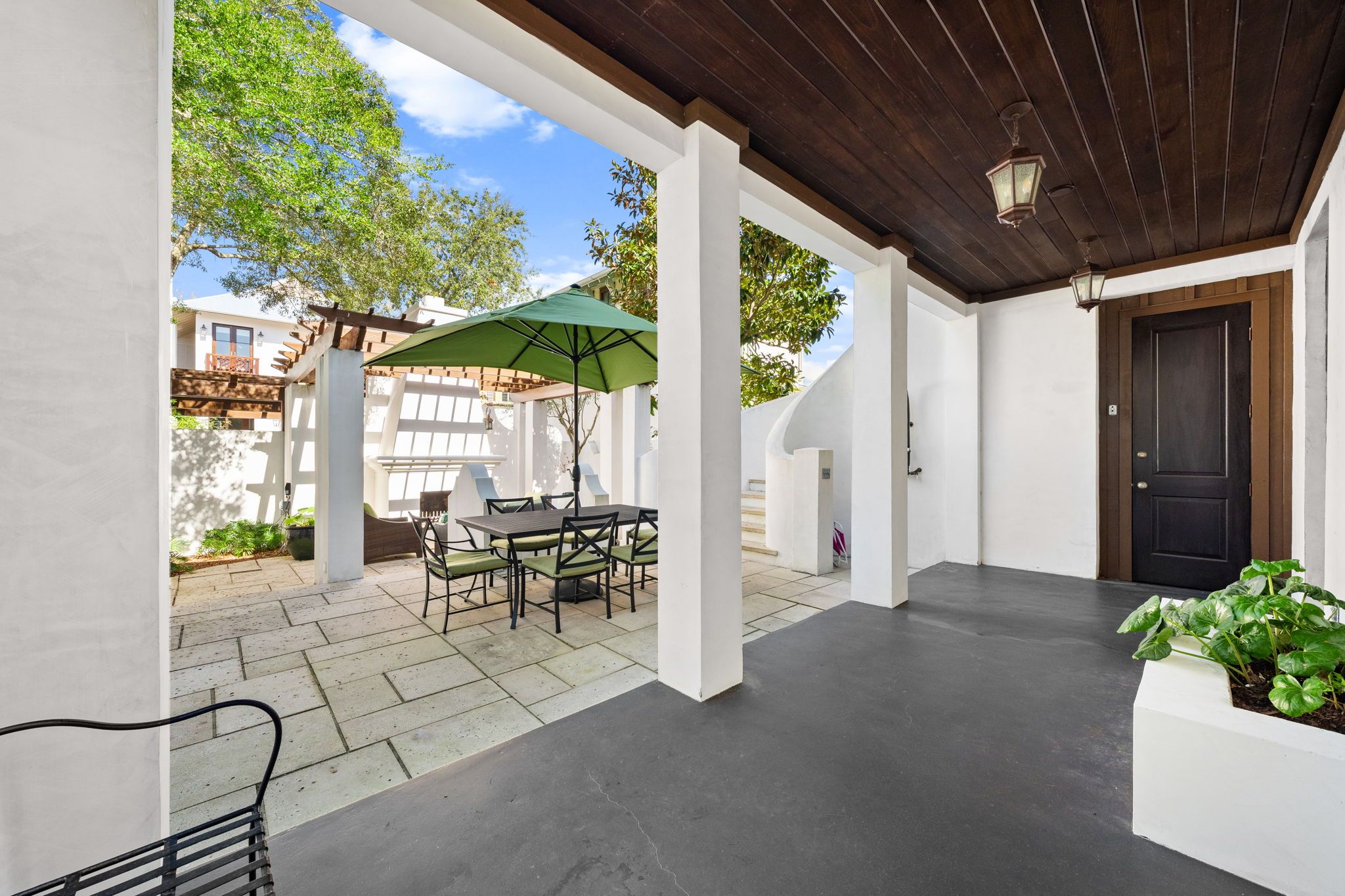Welcome to Kingston Cottage, a timeless Mediterranean-inspired retreat in the heart of Rosemary Beach. Designed with an inverted floor plan to maximize natural light and privacy, this home blends lush outdoor living with stylish interiors. The inviting courtyard, complete with a calming fountain, alfresco dining, and plush lounge seating, sets the tone for a truly relaxing coastal escape.